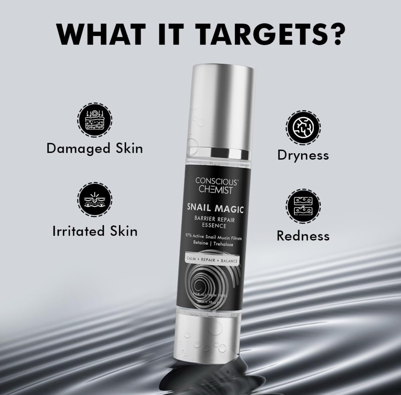 - INTRODUCING : Conscious Chemist Snail Magic Barrier Repair Essence is a serum-type skincare solution enriched with a 97% Active Snail Mucin filtrate, formulated to moisturize, calm, and rejuvenate the skin, all while enhancing its overall smoothness and radiance.